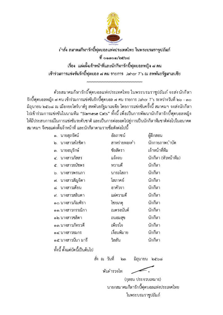 สมาคมกีฬารักบี้ฟุตบอลแห่งประเทศไทย ในพระบรมราชูปถัมภ์ ได้ทำการส่งนักกีฬาทีมชาติไทยเข้าร่วมแข่งขันรักบี้ 7 คนรายการ ยะโฮร์บาห์รู เซเว่นส์ ระหว่างวันที่ 26-30 มิ.ย.2568 ที่ประเทศมาเลเซีย