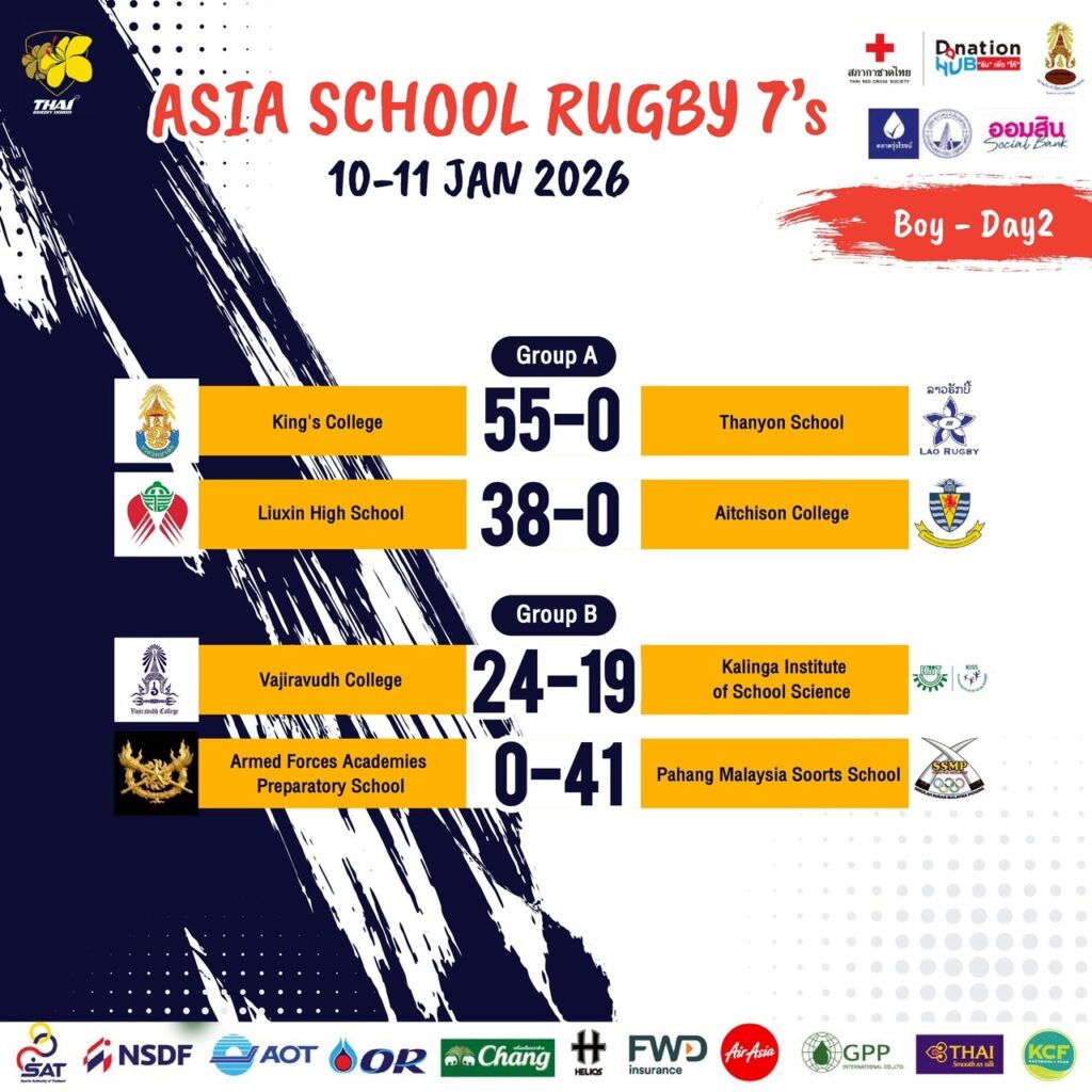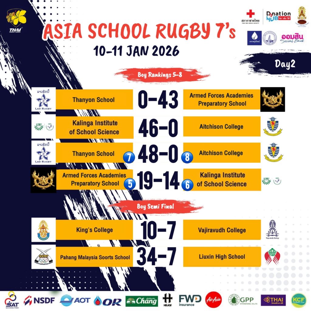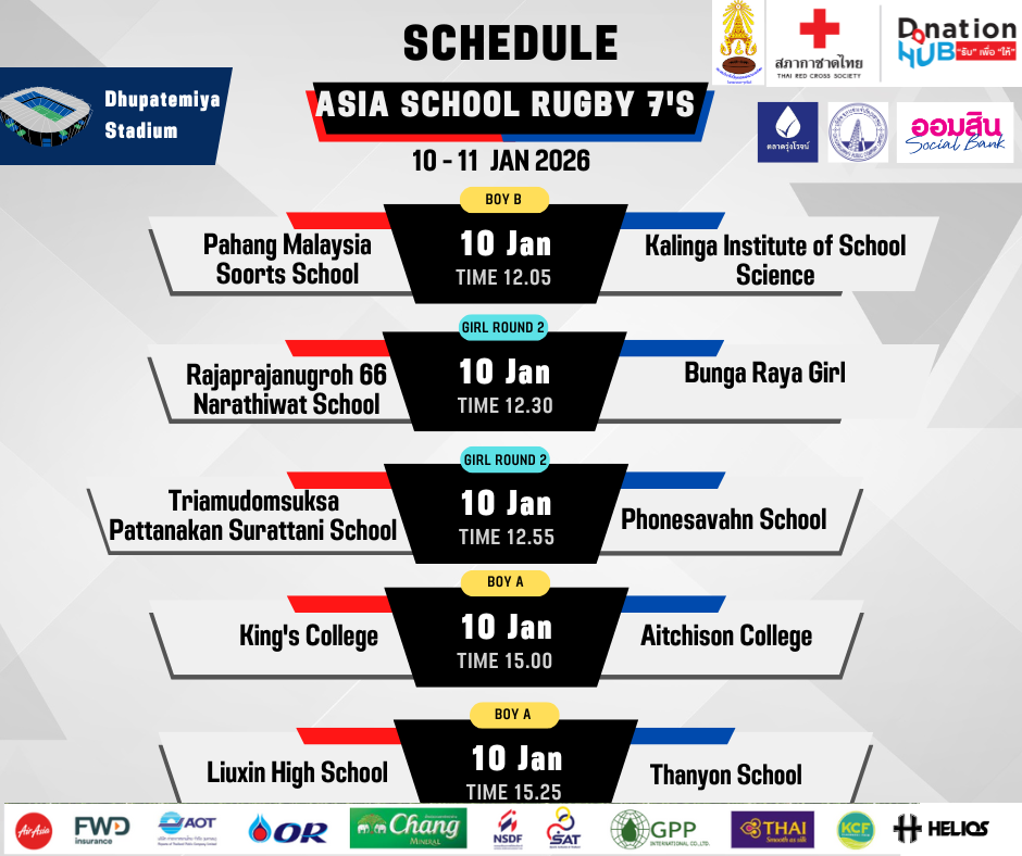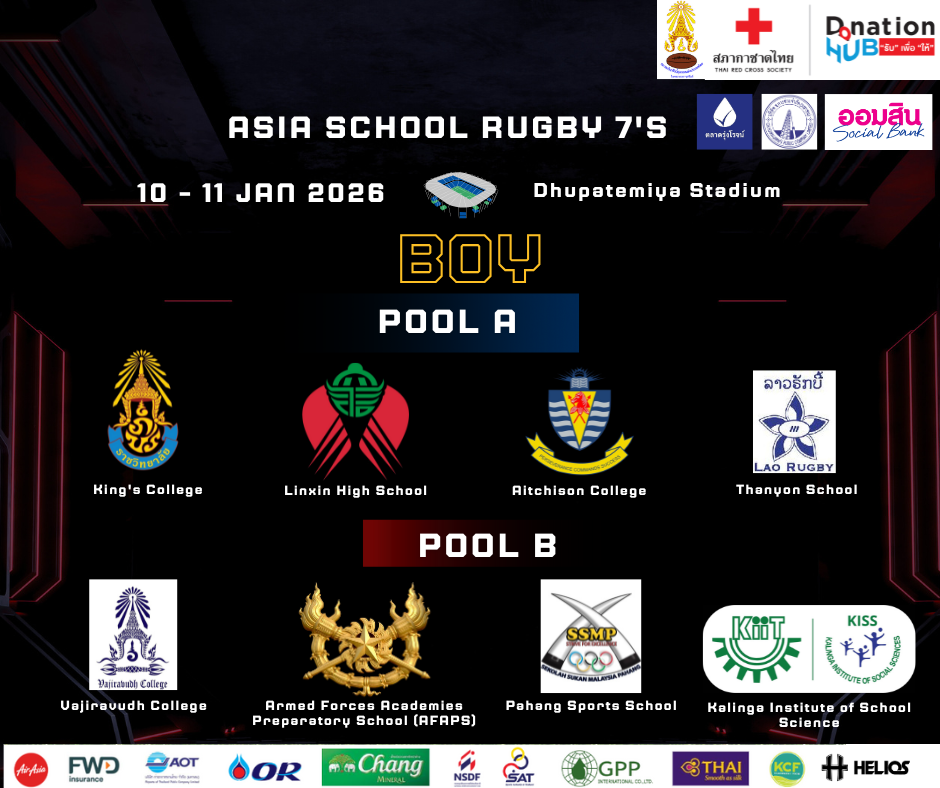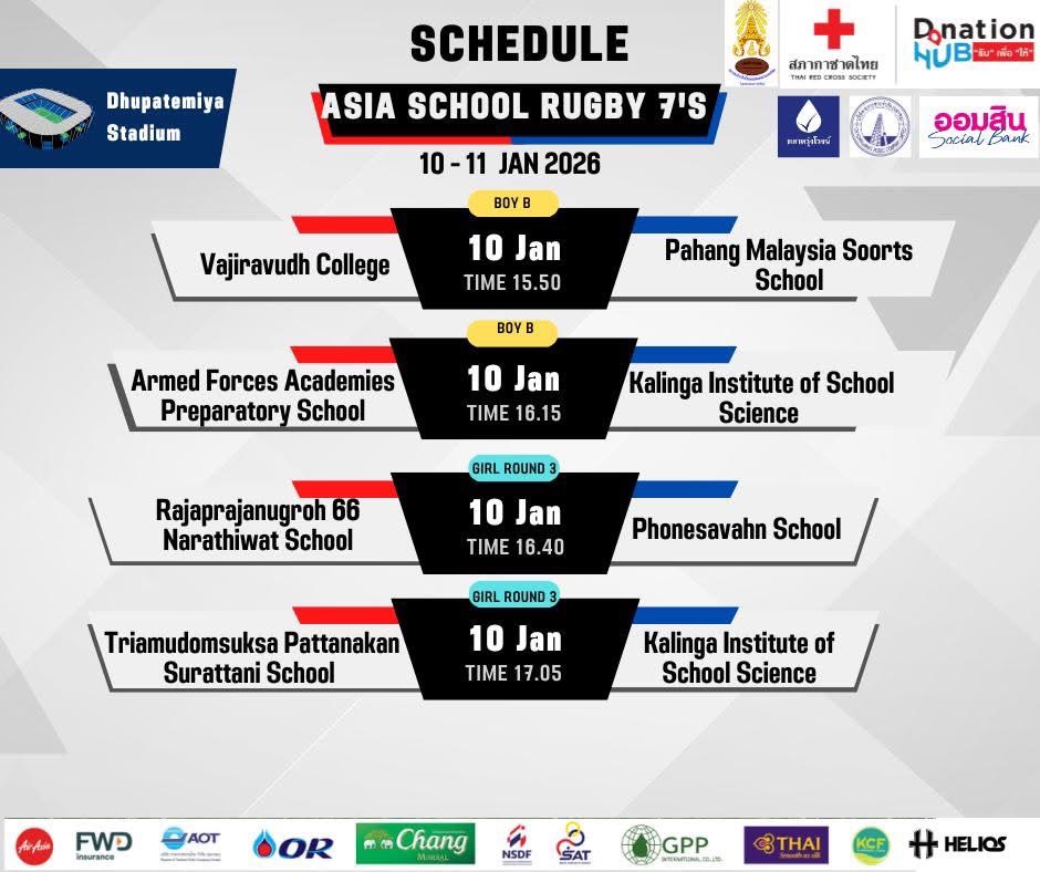 การแข่งขันรักบี้นักเรียน 7 คน ชิงชนะเลิศแห่งเอเชีย เพื่อสภากาชาดไทย ชิงถ้วยพระราชทานสมเด็จพระกนิษฐาธิราชเจ้า กรมสมเด็จพระเทพรัตนราชสุดาฯ สยามบรมราชกุมารี ระหว่างวันที่ 10-11 ม.ค.2569 แข่งขันที่สนามกีฬากองทัพอากาศ (ธูปะเตมีย์) โดยรายได้หลังหักค่าใช้จ่ายจะสมทบทุนช่วยเพื่อช่วยเหลือผู้ประสบภัยจากสถานการณ์ชายแดนไทย-กัมพูชา