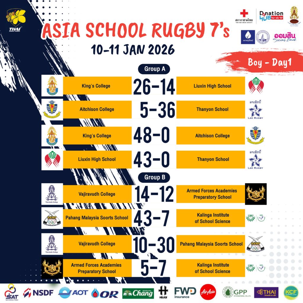 เมื่อวันที่ 10 มกราคมที่ผ่านมา เป็นการประเดิมสนามวันแรก รอบแรก ในส่วนของประเภททีมชาย ที่รอบแรกต้องแข่ง 3 นัด ทำให้ในวันแรกนี้แต่ละทีมจะต้องมีโปรแกรม 2 นัด และเก็บนัดสุดท้ายไปแข่งช่วงเช้าของวันถัดไป กลุ่มเอ ที่มี โรงเรียน ภ.ป.ร.ราชวิทยาลัย โชว์ศักยภาพสุดแกร่ง เอาชนะรวด 2 นัด โดยชนะ หลิวซิน ไฮสคูล จากไต้หวัน 26-14 จุด ก่อนจะโชว์ชนะ อิตชิสัน คอลเลจ จากปากีสถาน ไปแบบคลีนชีต 48-0 จุด